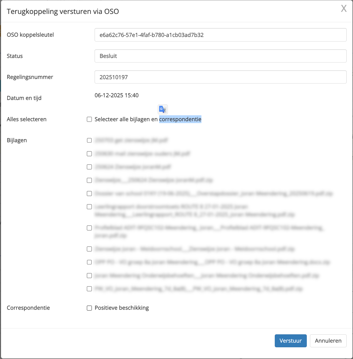 U kunt hier kiezen voor het meesturen van bijlagen en de correspondentie. Druk op Verstuur om te versturen. De terugkoppeling incl. de bijlagen worden nu teruggestuurd naar uw leerlingvolgsysteem.